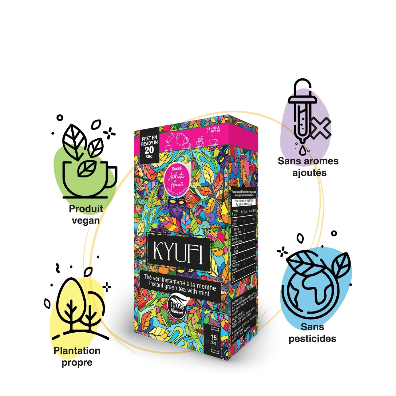 Le mélange Kyufi 100% naturel, inspiré de la tradition marocaine du thé vert à la menthe vous offre un moment gourmand en 20 secondes chrono. A déguster chaud ou avec des glaçons!